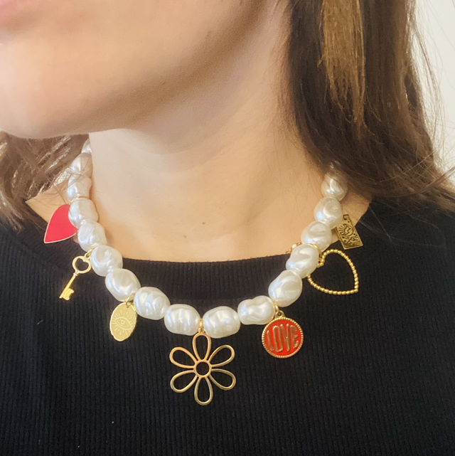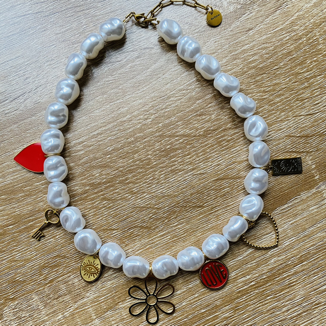 - un collier avec des perles blanches baroques imitation perles d’eau douce et 7 grigris en acier inoxydable et résine époxy.