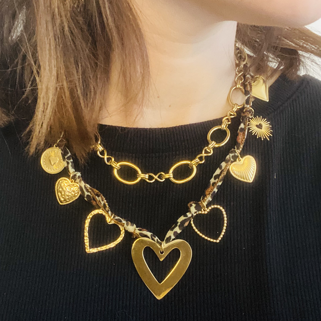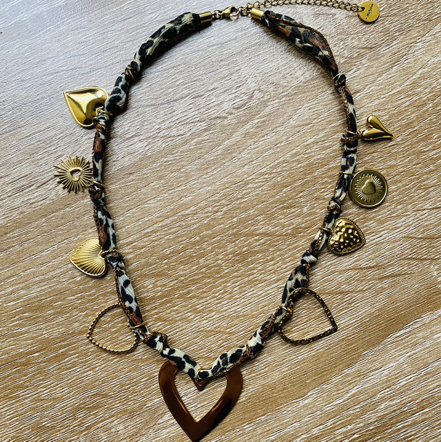 - Un collier avec un ruban léopard et 9 grigris coeurs en acier inoxydable.