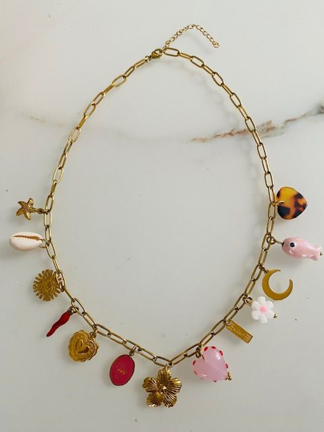 - un collier avec une chaîne dorée et 13 grigris pour vous porter chance en acier inoxydable, coquillage naturel, résine époxy, verre, nacre, céramique et acétate.